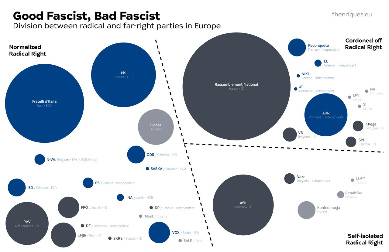 From migration to climate action, the EPP changed their own stance in order to copy the far-right. Then it made a clear division between what it considers good fascists and bad fascists. Half of Europe’s radical-right parties are now normalized, with parties like Fratelli d’Italia in Italy, Fidesz in Hungary and the ODS in Czechia running their respective countries in coalition with the EPP, while the other half is either behind an imposed cordon sanitaire – like France’s Rassemblement National – or happily behind such a wall – like Germany’s Alternative für Deutschland.