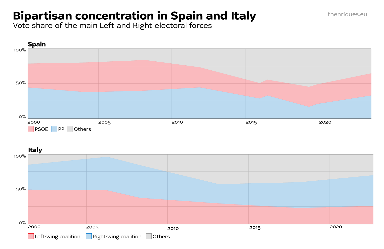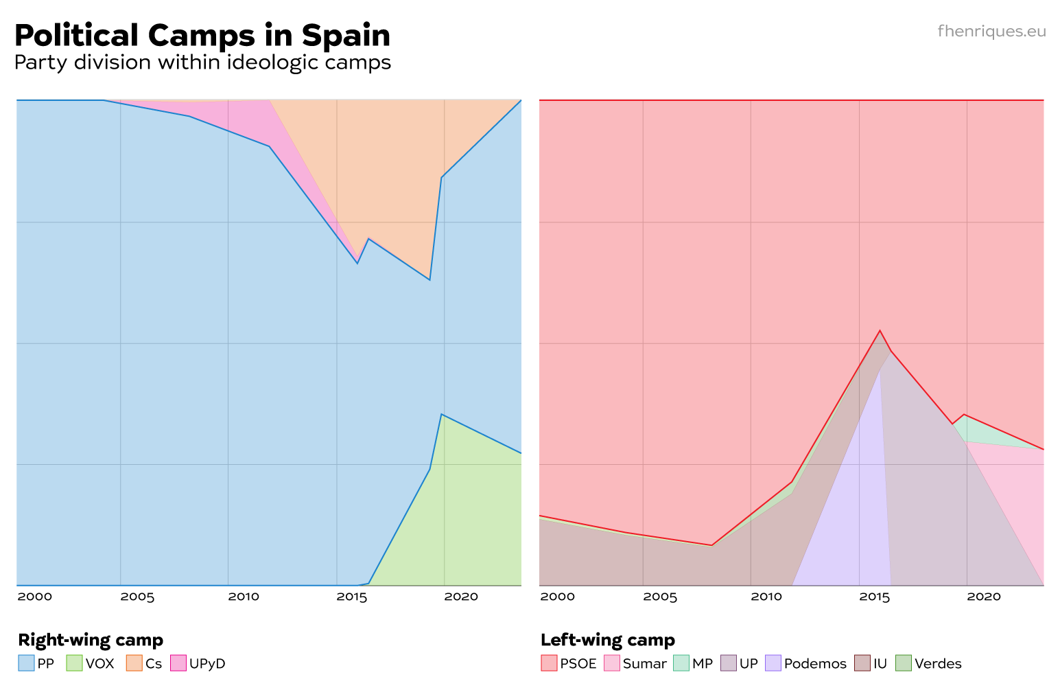 In Spain, this shift led to a bigger plurality within the two main blocs. The Left’s more radical wing grew stronger and evolved from Izquierda Unida into Podemos and now Sumar; on the Right, PP had to compete and ally first with liberal-conservative UPyD and Ciudadanos, and then with far-right VOX.