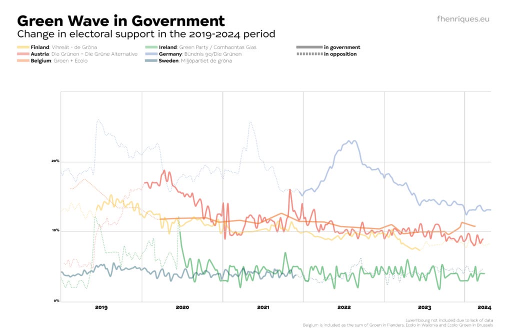 Five years ago, Greens went into the European elections on the crest of a “green wave”. In the autumn of the previous year, they had made significant gains in Luxemburg, Germany, and Belgium. The 2019 European elections confirmed that momentum: Greens became the second largest party in Germany and the third in France, Denmark, Ireland, and Luxembourg. Across most of northwestern Europe, they doubled their European Parliament seats. In subsequent national elections, they kept achieving historic results, which allowed them to enter several coalition governments – Finland in 2019, Austria, Belgium, and Ireland in 2020, Germany in 2021. In Luxembourg and Sweden, they had already been in power since 2013 and 2014 respectively. Greens grew in other parts of Europe too, joining governments in Spain (2020), Montenegro (2020), and Bulgaria (2021). In 2023, Poland and Latvia were added to the list.