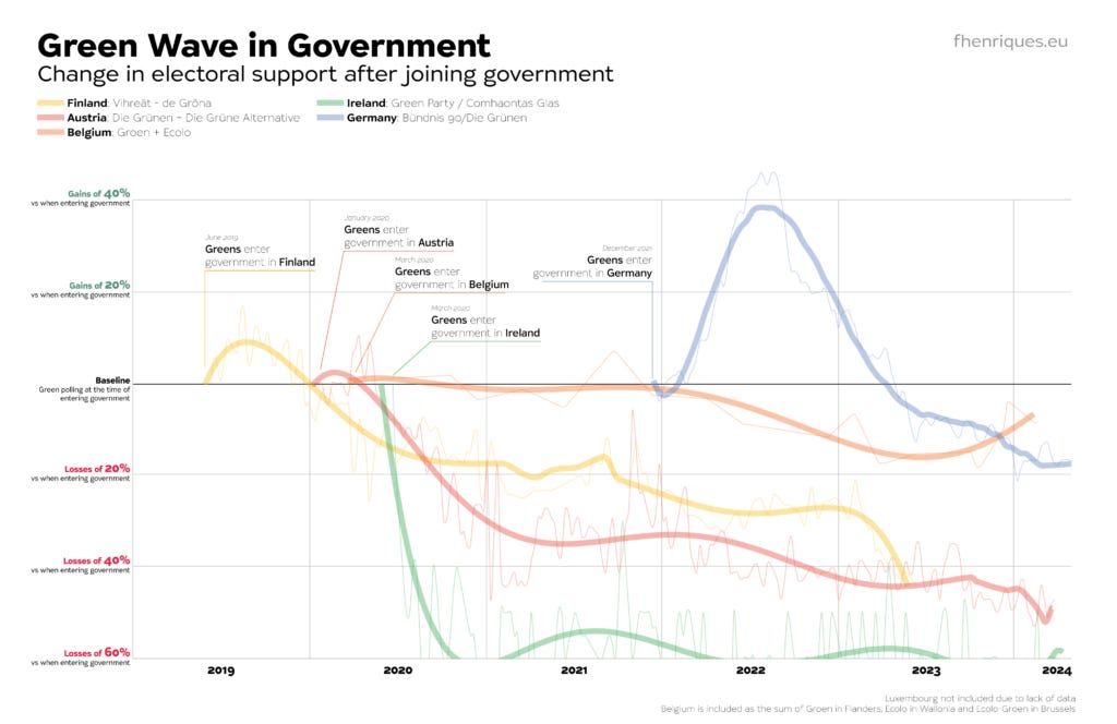 This overall picture inevitably raises the question: Is it wise for Greens to enter government and push for reform, even if it means having to compromise on their values and losing electoral support? Or is it better to remain in opposition, at the risk of having no role in crucial political decisions but potentially growing stronger for the next election?